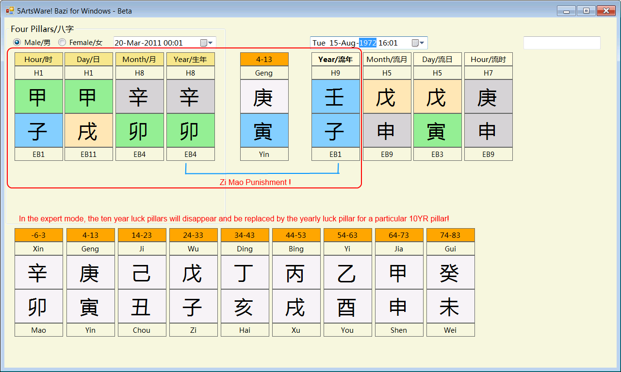 The next update will expand the combinations/clashes with the annual and ten year luck pillar. This is the main trick used by experienced old Bazi hands to deduce the happenings within the present/past luck pillars.